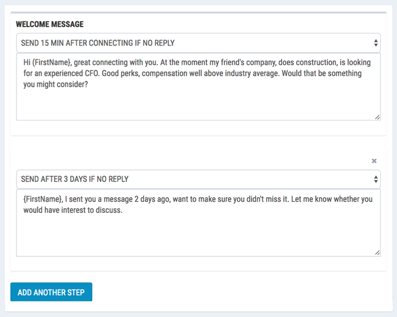 Automatically address new connections with a personalized message, automatically follow-up a few days later, if there is no response.